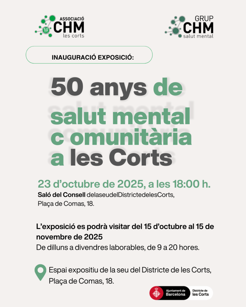 Además, este 2025 marca una fecha muy especial para la Associació Centre d’Higiene Mental Les Corts del Grup CHM Salut Mental, que celebra su 50º aniversario con una exposición conmemorativa en el Espacio Expositivo de la Sede del Distrito de Les Corts, en Plaça Comas, 18. La muestra, titulada «50 años de salud mental comunitaria en Les Corts”, estará abierta al público del 15 de octubre al 15 de noviembre y ofrece un recorrido único por los orígenes, evolución y retos futuros de la Asociación, mostrando su vínculo profundo con el distrito.
