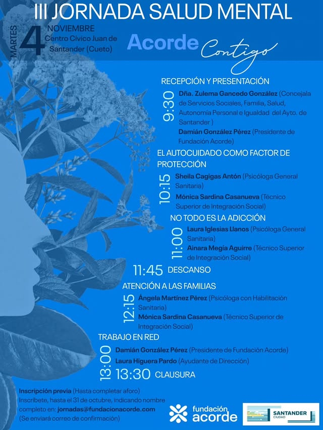 La Fundación Acorde organiza su III Jornada de Salud Mental, que se consolida como un espacio para la reflexión y el aprendizaje en torno a los desafíos actuales del sector. Este encuentro se focaliza en la prevención y el apoyo a las familias. Reflexionaran sobre el autocuidado, las adicciones en relación con la salud mental y el trabajo en red para seguir construyendo una sociedad más consciente y solidaria.