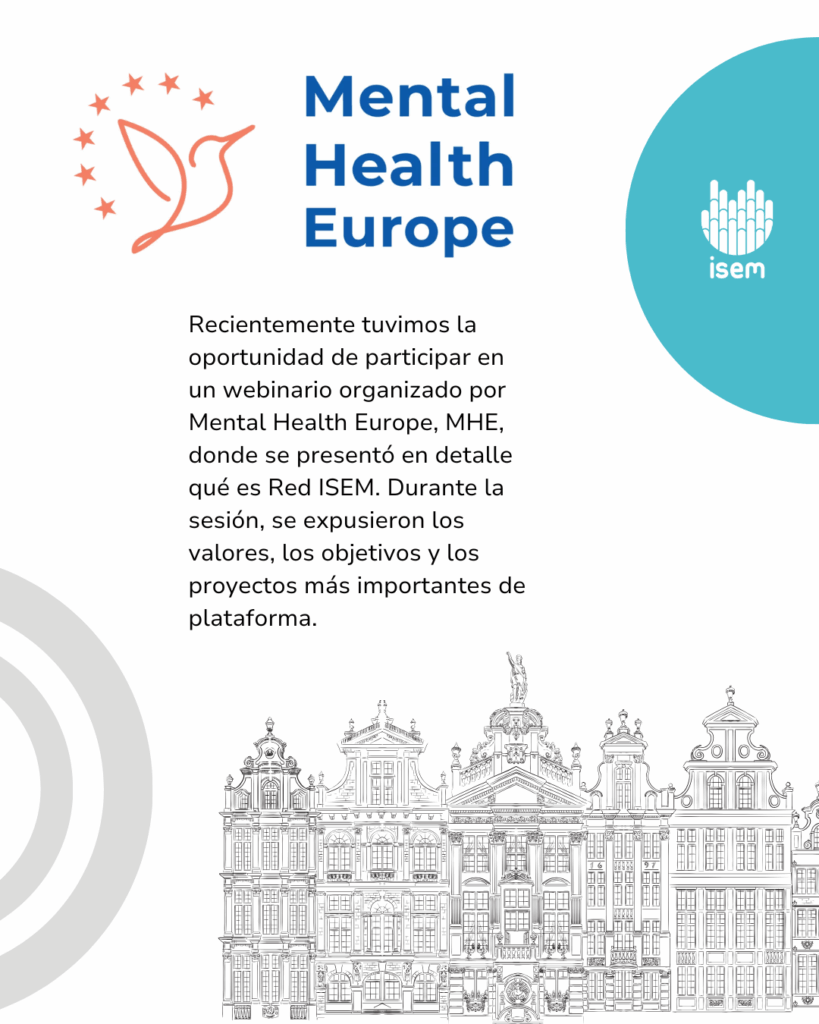 El pasado 2 de octubre de 2025, tuvimos la oportunidad de participar en un webinario organizado por Mental Health Europe, MHE, donde se presentó en detalle la Red ISEM. Nuestra plataforma tiene como objetivo principal fortalecer la colaboración entre sus miembros para generar un impacto concreto y sólido en el ámbito de la salud mental.