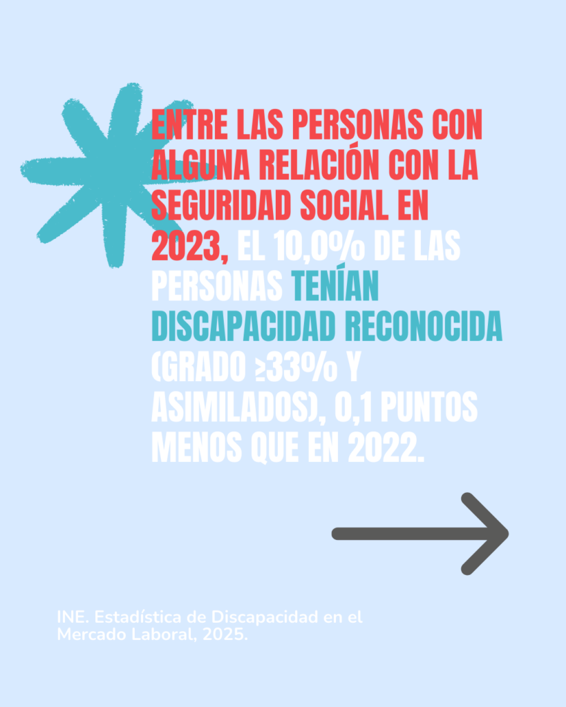 - De las 33.015.200 personas con relación a la Seguridad Social en 2023 con 16 o más años, 3.305.700 (el 10,0%) tenían discapacidad reconocida.