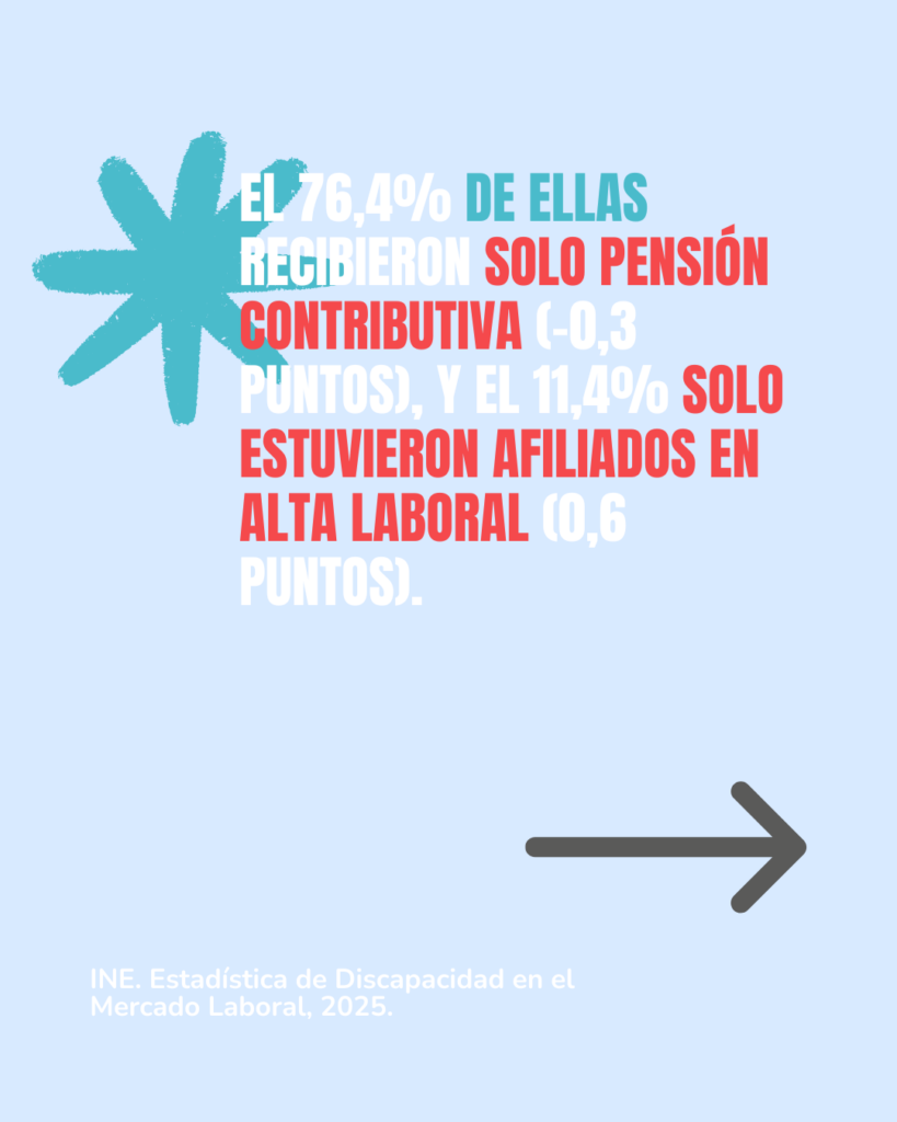 - De ellas, 2.526.700 recibieron solo una pensión contributiva, lo que representó al 76,4% del total con relación a la Seguridad Social, frente al 20,5% sin discapacidad, y 377.300 estuvieron en alta laboral exclusiva (11,4% frente a 63,3%).