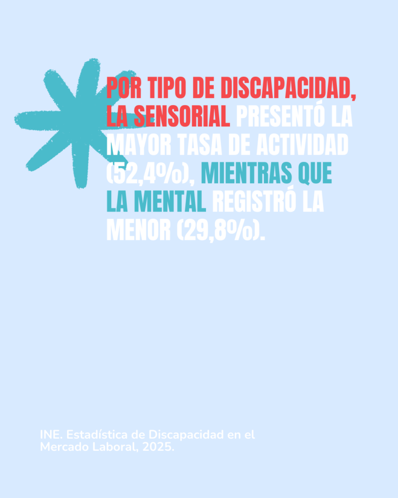 - Por tipo de discapacidad, la Sensorial presentó la mayor tasa de actividad (52,4%), mientras que la Mental registró la menor (29,8%).