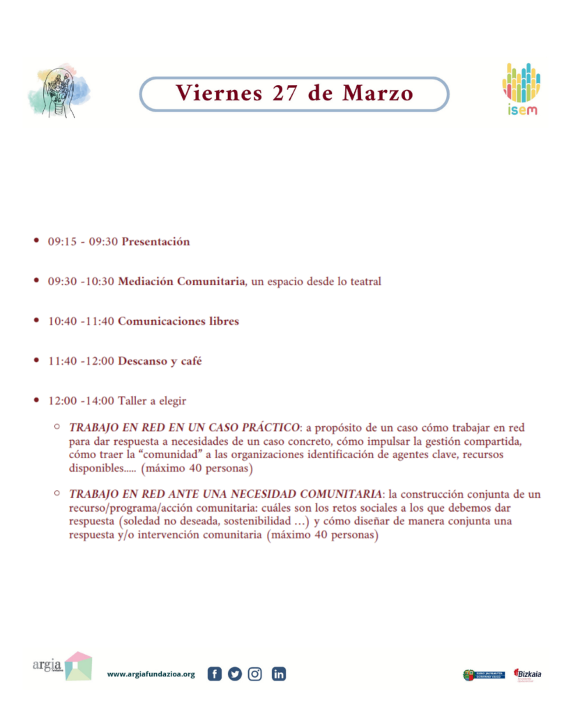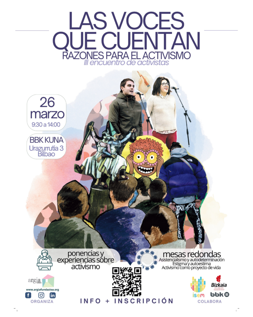 El mismo día que se celebran las XIV Jornadas Técnicas ISEM y XVI Jornadas Argia Fundazioa, en concreto, el 26 de 2026 en Bilbao, tiene lugar el III Encuentro de Activistas «Las voces que cuentan: razones para el activismo», programado específicamente el 26 de marzo de 2026 de 9:30 a 14:00 en BBK Kuna (Urazurrutia 3, Bilbao), organizado por Argia Fundazioa en colaboración con entidades como Bizkaia Foru Aldundia, Diputación Foral, ISEM y BBK. Este encuentro incluye ponencias y experiencias sobre activismo, mesas redondas sobre temas como asistencialismo vs. autodeterminación, estigma y autoestima, y el activismo como proyecto de vida, priorizando voces de personas con experiencia propia en salud mental para fomentar la inclusión comunitaria.
