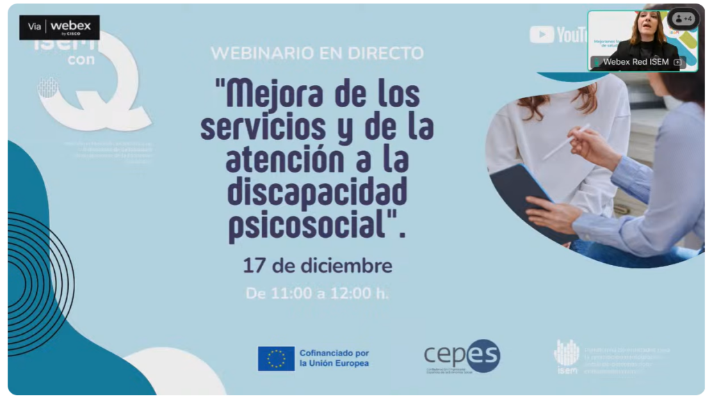 El pasado 17 de diciembre celebramos un webinario en directo, en YouTube, sobre la mejora de los servicios y la atención a la discapacidad psicosocial y la salud mental, en el marco del proyecto ISEMconQ.