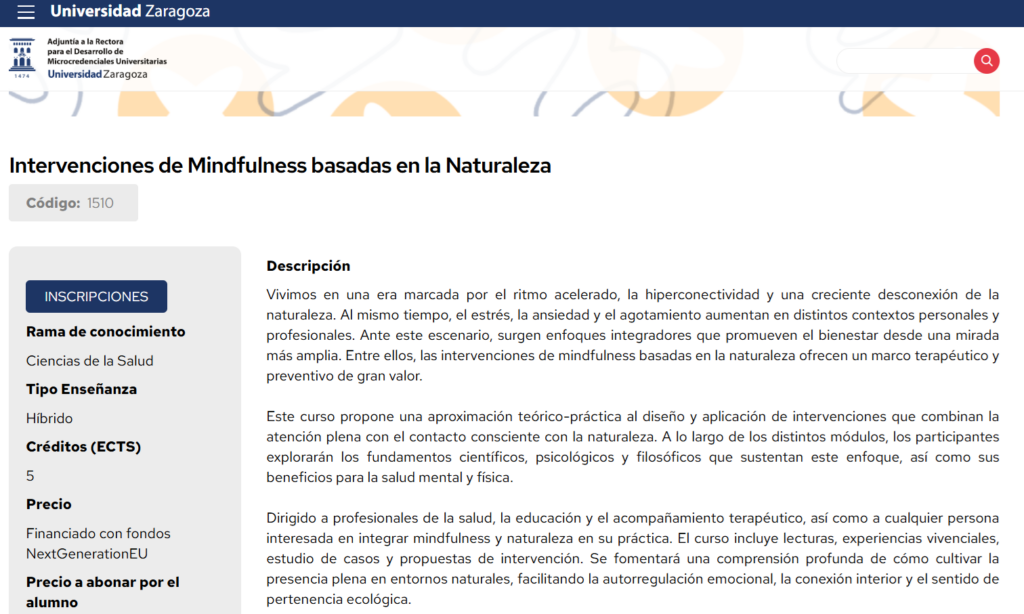 Este curso propone una aproximación teórico-práctica al diseño y aplicación de intervenciones que combinan la atención plena con el contacto consciente con la naturaleza. A lo largo de los distintos módulos, los participantes explorarán los fundamentos científicos, psicológicos y filosóficos que sustentan este enfoque, así como sus beneficios para la salud mental y física.