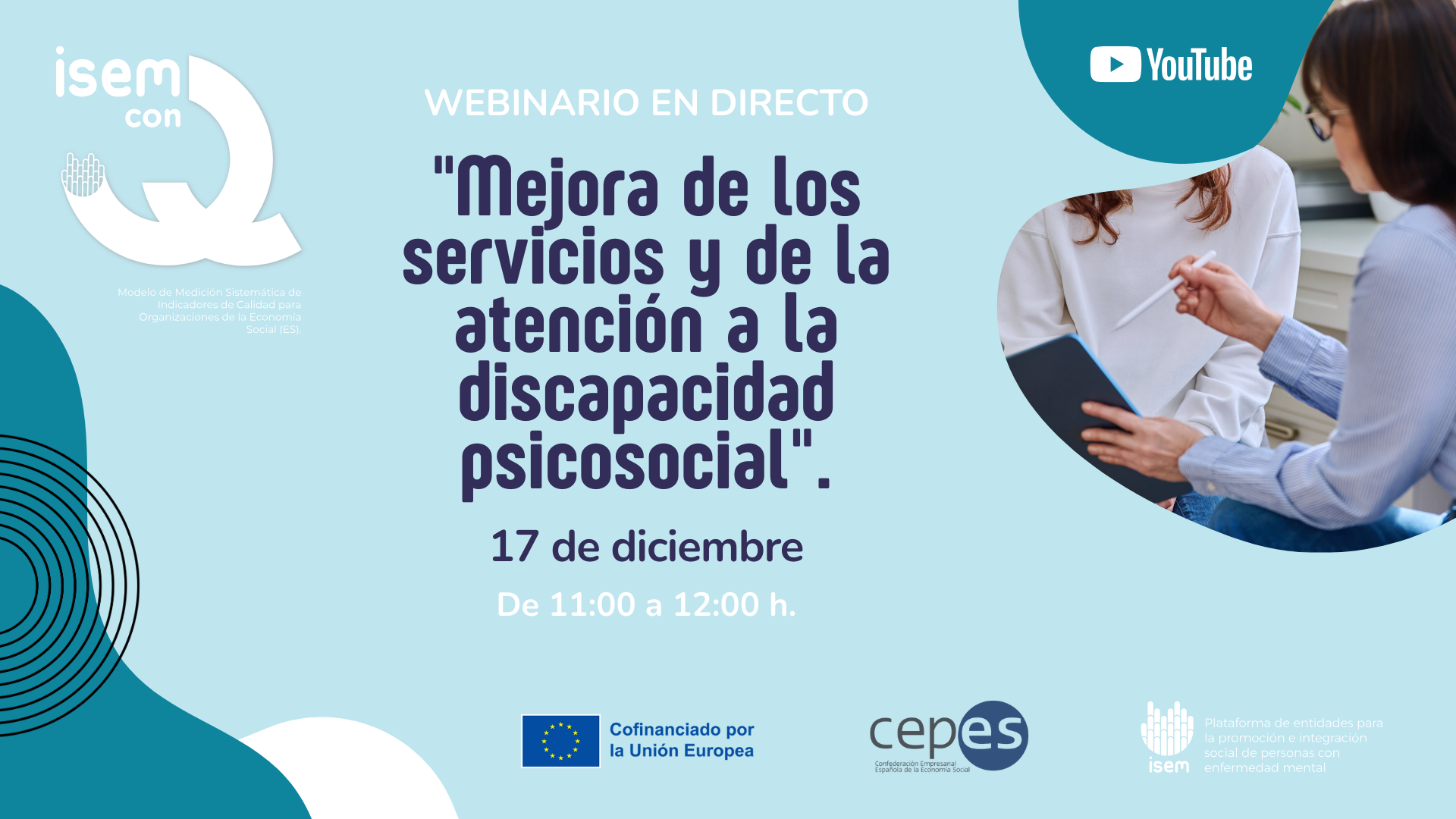El próximo 17 de diciembre de 2025, de 11:00 a 12:00 horas, se celebrará un webinario en línea organizado por Red ISEM en el marco del proyecto ISEMconQ, dirigido a entidades comprometidas con la calidad en discapacidad psicosocial y salud mental. El evento presentará la plataforma online ISEMconQ, que ayuda a las entidades a medir y mejorar sus datos mediante indicadores adaptados a su realidad para facilitar la toma de decisiones.