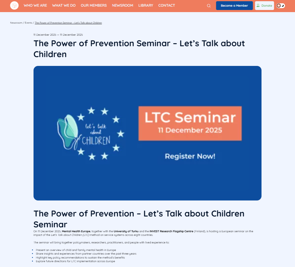 El seminario “The Power of Prevention – Let’s Talk about Children” se celebrará el 11 de diciembre de 2025 en el Residence Palace de Bruselas y también será accesible online. Está organizado por, la Universidad de Turku y el INVEST Research Flagship Centre (Finlandia) para tratar el impacto del método «Let’s Talk about Children» (LTC) en sistemas de servicio de ocho países europeos.
