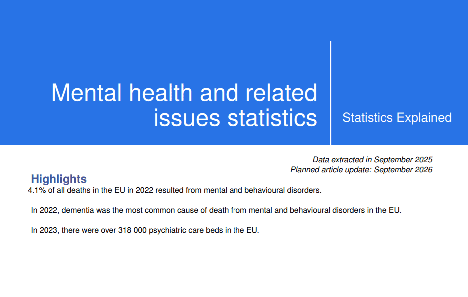 This article presents an overview of European Union (EU) statistics related to mental and behavioural disorders and intentional self-harm (which is an external cause of morbidity and mortality). Mental and behavioural disorders include, for example, dementia (a chronic or persistent mental health condition characterised by memory loss, personality changes and impaired reasoning), schizophrenia and psychoactive substance use disorders (such as alcohol or drug dependence). This article covers deaths from mental and behavioural disorders among residents, as well as the availability of specialist healthcare resources (hospital beds and healthcare personnel) for the treatment of mental and behavioural disorders.